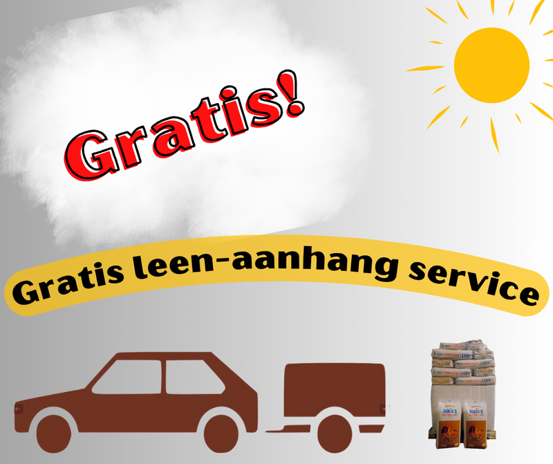 Geen gedoe meer om uw pelletkorrels in uw auto te proppen maar lekker makkelijk gebruik maken van onze gratis te gebruiken aanhangwagen om uw pellets naar huis te vervoeren. Onze aanhangwagen is voorzien van nieuwe en betrouwbare verlichting, een makkelijk neuswiel en een (verplichte) aanhanger net. Bij slecht weer kunt u gebruik maken van een dekzeil, zodat uw pellets droog blijven. Enige waar u zelf voor moet zorgen is een kentekenplaat voor op de aanhangwagen.